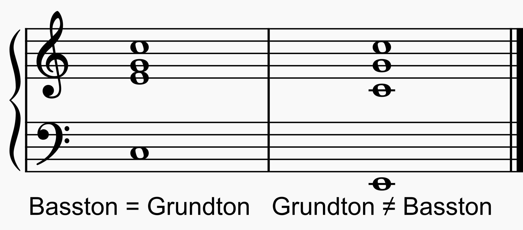 Auf der anderen Seite beschreibt der Basston den tiefsten Ton der im Akkord erklingt. Das muss aber nicht zwingend der Grundton sein, sondern es kann je nach Akkordstellung auch die Terz, die Quinte oder ein weiterer vierter Ton im Akkord. Jede Stellung hat einen bestimmten Namen. So ist zum Beispiel die Grundstellung die Stellung, bei der Grundton und Basston identisch sind.