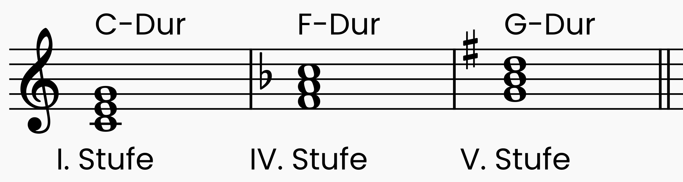 - Die Akkorde C-Dur (I. Stufe), F-Dur (IV. Stufe) und G-Dur (V. Stufe) sind eng verwandt und bilden das harmonische Zentrum der Tonart.