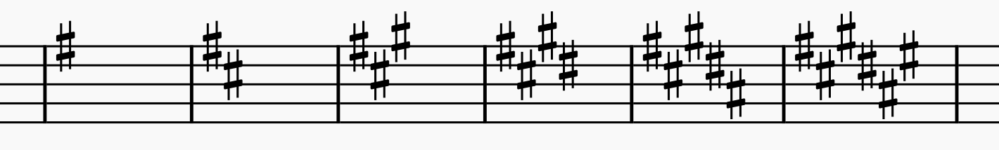 - Kreuz: Fis, Cis, Gis, Dis, Ais, Eis