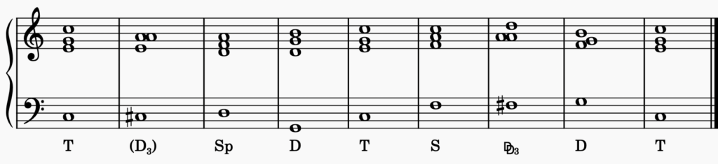 Aufgelöst werden Terz und kleine Septime wie zuvor (bei D7) und die große None folgt ihrem Verlangen und wird abwärts aufgelöst, was wiefolgt aussieht: