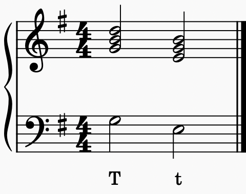 Wenn ein Stück nun in Moll geschrieben wurde, ist die sogenannte Moll-Tonika (t) immer noch auf dem ersten Ton der Tonleiter. Da alle Akkorde aber nur tonleitereigene Töne verwenden, erklingt die Moll-Tonika auch in Moll.