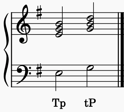 Ist die Grundtonart nun Moll, wird die Tonikaparallele mit tP bezeichnet (Merke: Ist der letzte Buchstabe der Abkürzung groß, so erklingt ein Dur-Akkord). Diese liegt in Moll nun auf der 3. Stufe, da es sich hier ja um eine Parallele handelt, also zwei Akkorde, die unmittelbar zusammengehören. In a-Moll ist es logischerweise C-Dur. Die tP folgt meistens auf eine Dominante.