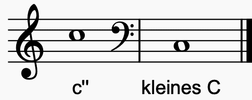 Die Grafiken zeigen den Unterschied zwischen Tönen im Violin- und im Bassschlüssel. Es ist leicht zu erkennen, dass der gleiche notierte Ton in beiden Schlüssel um fast zwei Oktaven höher bzw. tiefer klingt.